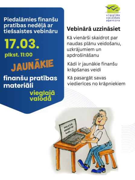 17. martā plkst. 11.00 aicinām jūs uz tiešsaistes vebināru "Jaunākie finanšu pratības materiāli vieglajā valodā", kurā iepazīstināsim ar jaunākajiem finanšu pratības materiāliem vieglajā valodā.